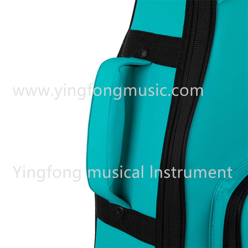 PM25DG-TFB Dreadnought Deluxe Bag,Tiffany blue waterproof fabric, grey soft velvet, with pillow, EVA handle (with rivets), reverse stitch zipper, 20mm EPE + 5mm PE board, lemon yellow color on the front head, one large front pocket + small accessory pocket, with shoulder strap buckle.